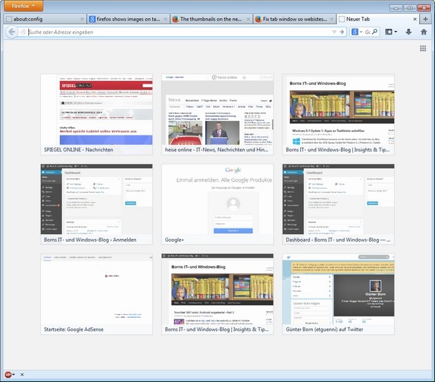 Michael Bormann weist in seinem Google+ Stream aber darauf hin, dass bei einer Neuinstallation ein neuer Tab die Bilder-Chronik besuchter Webseiten anzeigen könnte. Ist mir noch nicht aufgefallen – ich nutze hier aber auch den Firefox portable, den ich immer Updaten lasse – und die folgende Seite ist ja auch unverfänglich, obwohl die Miniaturen besuchter Webseiten schon auftauchen …