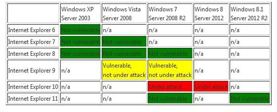 Die Verwendung des Internet Explorer 9 oder 10 mit aktiviertem Flash Player führt zu einer schwerwiegenden Sicherheitslücke, die zwischenzeitlich auch ausgenutzt wird. Auf das Problem wiesen Sicherheitsforscher der Site fireeye.com hin. Zwischenzeitlich gibt es ein Security Advisory von Microsoft, welches die betroffenen Produkte auflistet – und für mich überraschend: Auch der IE 6, der IE 7, der IE 8 und der IE 11 tauchen in der Liste auf – und betroffen sind wohl alle Windows-Versionen. Hier eine grafische Übersicht von dieser Microsoft-Seite (die das Fixit auch anbietet).
