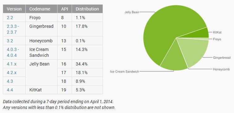 Auch im April 2014 gibt's neue Zahlen von Google zur Verteilung der Android-Versionen auf aktuellen Geräten. Für die letzten 7 Tage im März 2014 gibt Google in android.developer.com an, dass Android 4.4 (KitKit) auf 5,3 % der Geräte läuft.