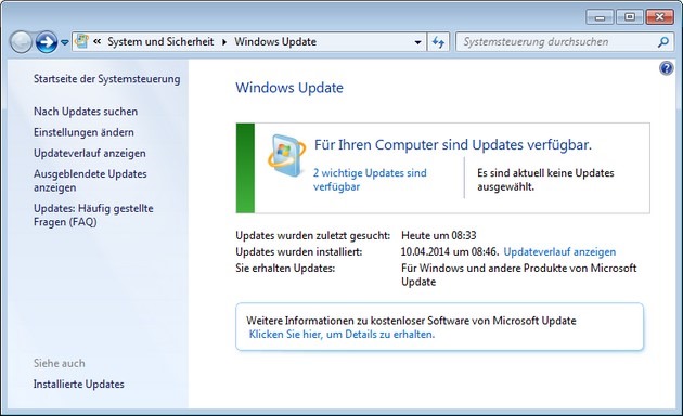 Obige Update-Seite meldet mir, dass zwei wichtige Updates verfügbar wären – aber eine Update-Benachrichtigung habe ich keine im Infobereich der Taskleiste erhalten. Gehe ich in die Details, wird mir folgendes angezeigt.