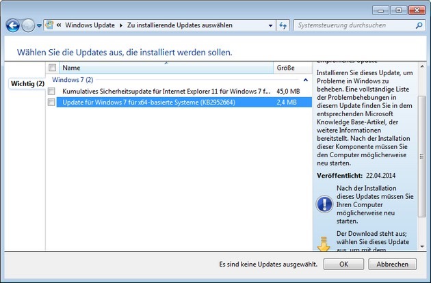Ich muss also das zu installierende Update auswählen. Der Microsoft KB-Artikel 2952664 ist auch nicht so sonderlich aufschlussreich. Es handelt sich um ein Kompatibilitäts-Upgrade für Windows 7, welches die Upgrade-Erfahrungen "auf die letzte Windows-Version" verbessern soll.