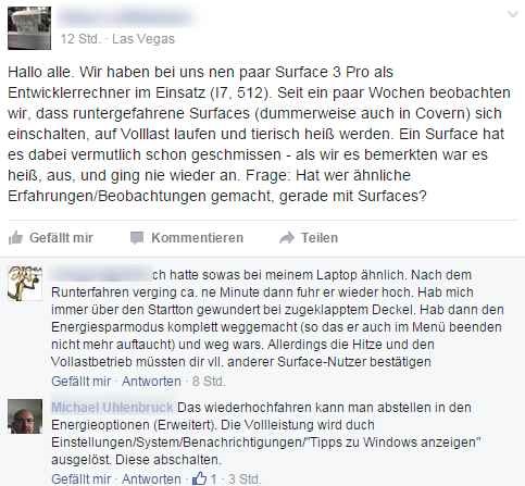 Auf das Thema aufmerksam wurde ich durch ein Posting bei Facebook, in dem ein Nutzer sich beklagt, dass Surface Pro 3 Entwicklungsrechner mit iCore i7 CPU und 512 GByte SSD sich nach dem Herunterfahren automatisch wieder einschalten. Ist das Type Cover eingeklappt überhitzen die Geräte.