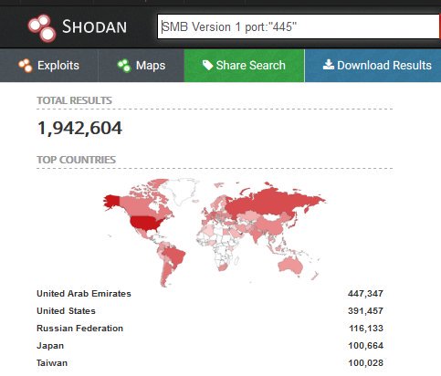 Heute morgen hatte ich im Blog-Beitrag Sicherheitsinfos: WannaCry, Locky, Hacks und mehr darauf hingewiesen, dass einen Monat nach WannaCry neue Infektionen (z.B. bei Honda in der Produktion) auftraten. Es gibt also offenbar eine Menge ungepatchte Systeme mit SMBv1-Sicherheitslücken. Die Suchmaschine Shodan wirft fast 2 Millionen Systeme aus (siehe folgende Karte – via Twitter).