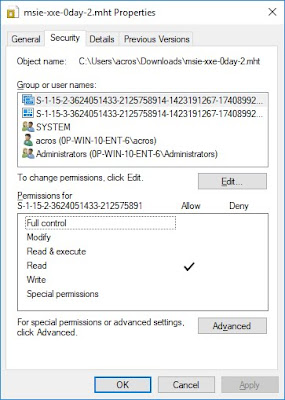Nach ein wenig Frustration, schlug Twitter-Nutzer Eric Lawrence vor, die Berechtigungen für diese Dateien zu überprüfen. Obiges Bild zeigt die Berechtigungen beim Download per IE und Edge. Edge schien zwei Einträge zum AC der heruntergeladenen Datei hinzugefügt zu haben, beide für einige SIDs, die Windows nicht in einen Namen übersetzen kann.