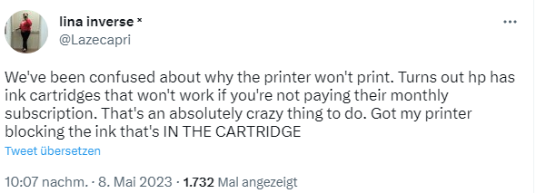 Hier war nach meiner Lesart wohl ein Abo zum Bezug von Tintenpatronen von HP im Spiel und die Nutzerin hat sich nach dem Ablauf des Abos Cartridges von HP besorgt, musste aber feststellen, dass das Gerät damit nicht mehr druckt. Der HP-Support hat der Kundin zwar weiter geholfen – die schrieb auf Twitter, dass das Problem "durch andere Tintenpatronen behoben worden sei".