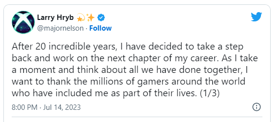 Im Juli 2023 gab Hryb bekannt, dass er sich entschlossen hat, "einen Schritt zurückzutreten und an dem nächsten Kapitel meiner Karriere zu arbeiten". Er bedankte sich bei Fans und Kollegen und kündigte an, dass der Official Xbox Podcast nach seiner Sommerpause mit einem neuen Format zurückkehren würde.Personalabgang bei Microsoft. Die Woche wurde bereits bekannt, dass bei Microsoft zusätzliche Entlassungen von Mitarbeitern (über die im Januar 2023 angekündigten Entlassungen) anstehen (siehe z.B. diesen Beitrag). Nun ist eine weitere Personalie bekannt geworden – Larry Hryb, Programmdirektor für das Microsoft-Gaming-Netzwerk, verlässt das Unternehmen nach 20 Jahren.