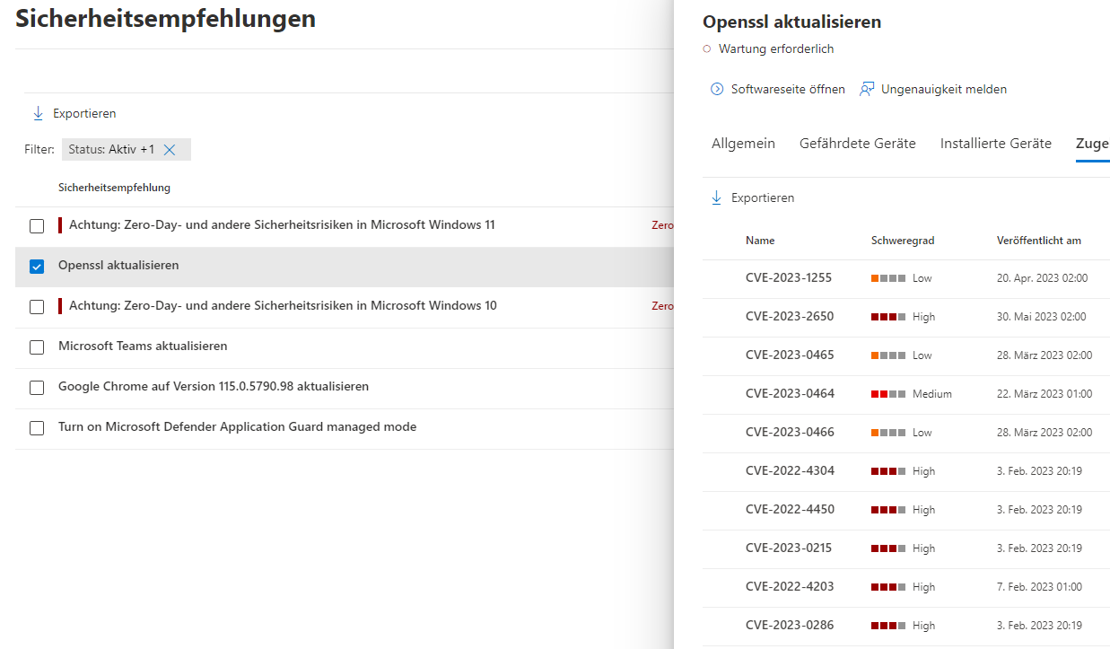Für „Open SSL" gibt es eine Reihe CVE's. Unter „Microsoft 365 Defender" wird Open SSL wegen der CVE's als Sicherheitsempfehlung gemeldet.