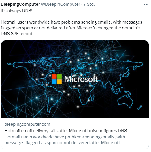Benutzer, die Microsofts E-Mail-Dienst Hotmail verwenden, stehen seit dem 17. August 2023 vor dem Problem, dass sich keine Mails versenden lassen. Die Probleme reichten wohl vom Kennzeichnen der Nachrichten als Spam oder bis zur Ablehnung der Zustellung. Hintergrund ist wohl, dass Microsoft den DNS SPF-Eintrag der Domäne geändert hat. Nach einem Nutzerhinweis per Mail habe ich nun auch weitere Berichte zu dieser Störung gefunden. Microsoft hat das Problem am 18. August 2023 am späteren Nachmittag (nach 16:00 Uhr deutscher Zeit) wohl behoben.