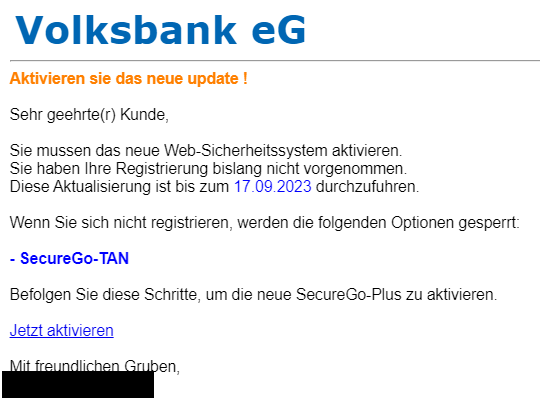 Die Phisher machen sich wohl die Unsicherheiten der Kunden von Volks- und Raiffeisenbanken zu nutze, die vielleicht nicht wissen, wie die Freischaltung genau abläuft. Zum 18. September 2023 sah sich die Verbraucherzentrale per Phishing-Radar auf eine Spam-Welle mit Phishing-Mails hinzuweisen, die auf diesen Kundenkreis zielt. Die Kundschaft der Volksbank habe weiterhin mit Phishing zu kämpfen, heißt es. In der aktuellen Variante wird behauptet, der Kunde habe das neue Web-Sicherheitssystem SecureGo-TAN noch nicht aktiviert. Er wird dazu aufgefordert, das neue Web-Sicherheitssystem "SecureGo-Plus" bis zum 17.09.2023, also dem Tag des Empfangs der Mail, zu aktivieren. Nachfolgend ist eine solche Mail abgebildet.