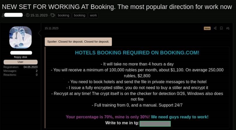 Werbung eines Hackers in einem Forum, um Komplizen für den Hotel-Betrug über Booking.com zu gewinnen. Quelle: Check Point Research