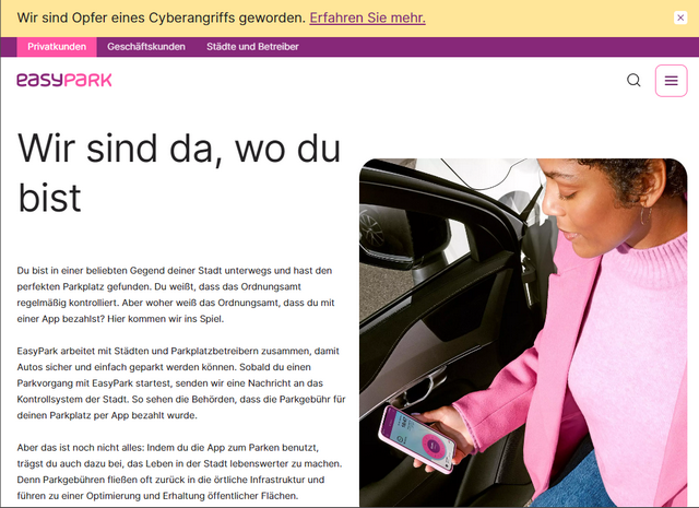 "EasyPark wurde Opfer eines Cyberangriffs, bei dem auf Ihre persönlichen Daten zugegriffen wurde. Mehr erfahren Sie auf unserer Website."