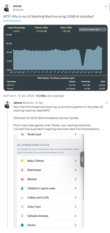 Der Ursprungs-Tweet zeigt den Internet-Traffic über einen Tag für das LG-Gerät und hat inzwischen mehr als 17 Millionen Abrufe kassiert. In der Statistik sieht man, dass 3,57 GByte an Daten pro Tag an LG übermittelt werden, während die Waschmaschine zusätzlich 96,74 MByte an Daten von den LG-Servern zieht. Viele Beobachter haben John gefragt, warum die Waschmaschine überhaupt einen Internetanschluss benötigt. John widmet das Ganz dann in einen Witz um, und meint, dass die LG-Waschmaschine DLCs herunterladen muss.