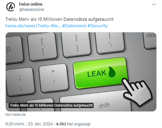 heise hat den Vorfall in diesem Beitrag aufgegriffen. Have I been pwned (HIBP) ist es gelungen, die betreffenden Datensätze zu bekommen und hat diese in seine Datenbank eingefügt. Trello-Nutzer können also hier prüfen, ob sie betroffen sind.