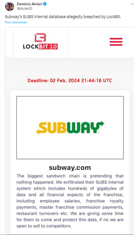Die Tage wurde bekannt, dass die Ransomware as a Service (RaaS)-Gruppe Lockbit bei der Franchise-Kette Subway zugeschlagen hat. Ich hatte die Informationen über nachfolgenden Tweet mitbekommen.