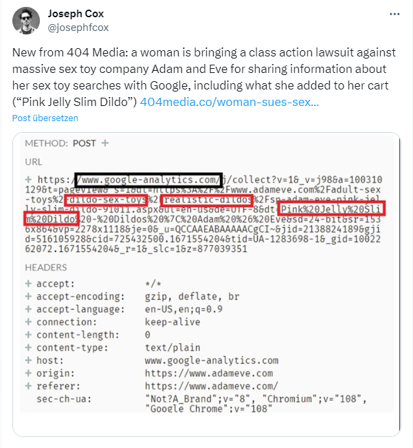 - Josef Cox berichtet in diesem Artikel, dass ein Frau eine eine Sammelklage gegen den großen Sexspielzeughersteller Adam and Eve, weil er Informationen über ihre Suchanfragen nach Sexspielzeug an Google weitergibt. Nachfolgender Tweet gibt einen Einblick, was so an Google mitgeteilt wird, was im Einkaufswagen liegt.
