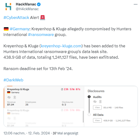 Kreyenhop & Kluge ist Opfer der Hunters International Ransomware-Gang geworden. Das geht aus nachfolgendem Tweet hervor, in dem mich HackManac über den Vorfall informiert hat. Die Hunters International Ransomware-Gruppe gibt an, 438,9 GB an Daten, insgesamt 1.241.127 Dateien, bei der Infektion abgezogen zu haben. Als Frist zur Zahlung eines Lösegeld wurde der 13. Februar 2024 festgelegt.