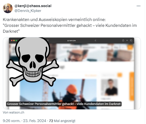 Der Schweizer Personalvermittler "Das Team" ist wohl Opfer der Ransomware-Bande Black Basta geworden. Dabei sollen 200 Gigabyte an Daten gestohlen worden sein. Diese Datensätze tauchen nun im Darknet auf. Mit in den Datensätzen sollen auch Krankenakten und Ausweiskopien enthalten sein. Das Unternehmen bestätigt den Ransomware-Angriff und will auch den Eidgenössischen Datenschutzbeauftragten (EDÖB) vorinformiert haben.