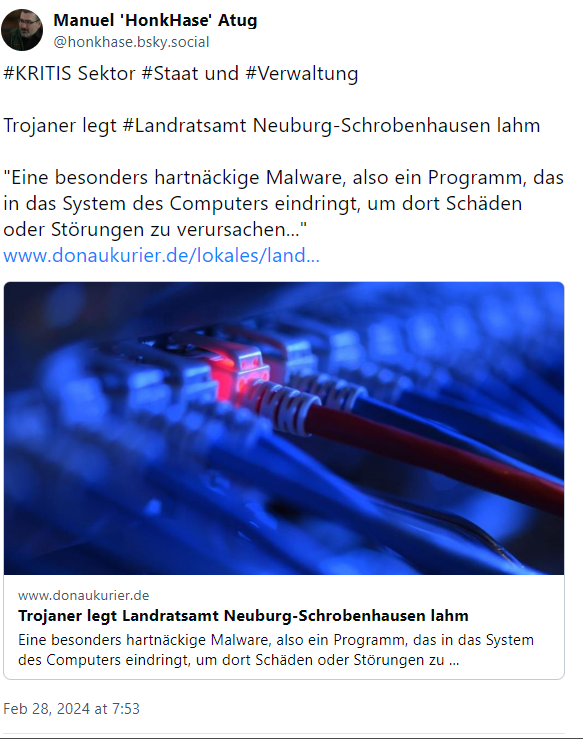 Heute früh ist mir dann noch eine besondere Sprachperle im Zusammenhang mit einem Cyberangriff auf das Landratsamt Neuburg-Schrobenhausen untergekommen. HonkHase weist in einem Post auf BlueSky auf den Vorfall hin, den eine Volontärin beim Donau Kurier aufbereitet hat.