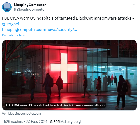 Die Kollegen von Bleeping Computer greifen in diesem Artikel die Warnung von FBI und CISA auf, dass US-Krankenhäuser mit gezielten Ransomware-Angriffen der BlackCat-Affiliates rechnen müssen. Kann man auch für unsere hiesigen Klinken fortschreiben.