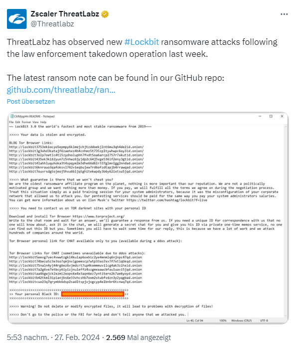 Scheint aber nicht der Fall zu sein, denn in obigem Tweet berichtet ZScaler ThreatLabz, dass sie neue Lockbit-Ransomware-Angriffe beobachtet haben, nachdem die Strafverfolgungsbehörden in der vergangenen Woche die Ransomware zerschlagen hatten.