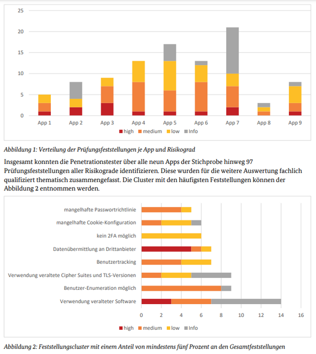 Zu einer App schreibt das BSI: „Bei der Verteilung der Prüfungsfeststellungen sticht eine App positiv heraus, die lediglich zwei Feststellungen mit dem Risikograd „medium" und „low" sowie eine „Info"-Feststellung verzeichnet."