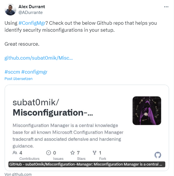Bleeping Computer hat das Thema in diesem Artikel aufbereitet. Mir ist dann folgender Tweet untergekommen, der auf diesen GitHub-Beitrag verweist. Misconfiguration Manager ist eine zentrale Wissensbasis für alle bekannten Microsoft Configuration Manager-Methoden und die damit verbundenen Anleitungen zur Verteidigung und Absicherung.