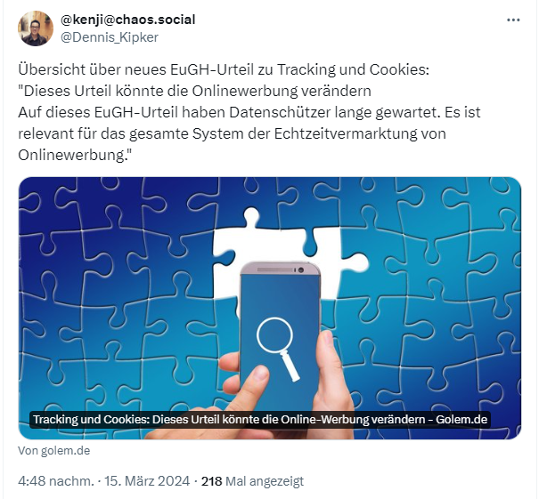 Obiger Tweet weist auf diesen Artikel von Golem hin, die das Urteil aufbereiten. Generell ist das EuGH-Urteil aus meiner Sicht schwer interpretierbar – es urteilt nur, dass die IAB durch des TCF einen Einfluss auf die Verarbeitung persönlicher Daten nimmt. Aber der EuGH setzt dieser Verantwortlichkeit auch Grenzen, nämlich, wenn dem IAB nicht nachgewiesen werden kann, dass dieses Einfluss auf die Daten nimmt.