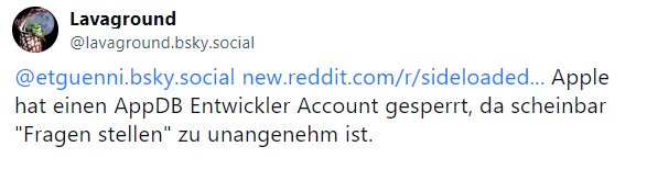 Der Fall ist mir bereits im Februar 2024 durch einen Blog-Leser auf BlueSky gesteckt worden. Apple hat den Account der Firma appdb aufgespürt und dann gekündigt. Der betreffende Fall ist auf reddit.com in diesem Post dokumentiert worden.