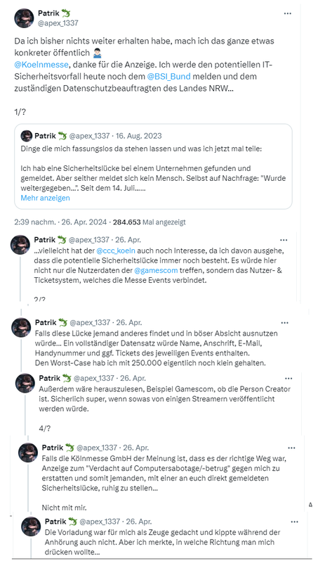 Zum 26. April 2024 hat sich apex_1337 dann in einer Serie von Tweets zu seinen Erfahrungen in diesem Fall ausgelassen – dort ist mir der Sachverhalt erstmalig aufgefallen. Im Hinblick auf die gemeldete potentielle Schwachstelle hat die betreffende Person nichts von der Koelnmesse gehört, schreibt aber, dass er im Januar 2024 Post im Auftrag der Staaatsanwaltschaft Köln bekam und als "Zeuge" zur Anhörung geladen wurde. Kann ja passieren, wenn die Ermittler versuchen ggf. alle Informationen zu bekommen, die ermittelbar sind.
