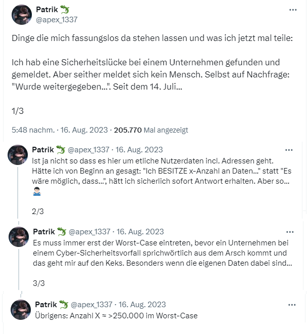 Mir sind die Details der möglichen Schwachstelle weiterhin unbekannt, man kann einiges aus den Tweets interpretieren. Was mich aber sofort getriggert hat, waren die Tweets vom 26. April 2024, in der der Betroffene seine Sicht der Dinge schildert. Mir kam sofort die Erinnerung an den Fall Modern Solutions in den Sinn, wo das die Schwachstelle zu verantwortende Unternehmen Anzeige bei der Staatsanwaltschaft Köln stellte. Das Ganze endete vorläufig mit einem Strafbefehl über 5.000 Euro gegen den Entdecker der Sicherheitslücke – wobei gegen dieses Urteil Revision eingelegt wurde (siehe nachfolgende Links).