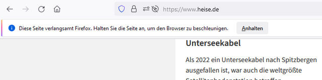Auch der Firefox beschwerte sich und meldete in einem Banner, dass die Seite von heise.de den Browser verlangsamt. Nachfolgend ist eine solche Meldung abgebildet.