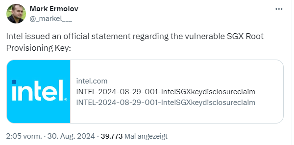 Mark Ermolov von der russischen IT-Sicherheitsfirma Positive Technologies tüftelt seit geraumer Zeit an den Intel CPUs und deren Sicherheitstechnologien herum (siehe z.B. Intels Management Engine (ME) erneut gehackt). Ende August 2024 ist mir nachfolgender Tweet von Ermolov auf X untergekommen.