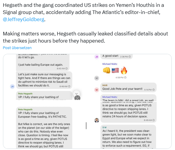 Bei Bedarf lassen sich Details im verlinkten The Atlantic-Artikel oder in diesem Focus Online-Artikel nachlesen. So werden die Europäer als Schmarotzer dargestellt, die sich von den USA wieder aus der Patche heraushelfen lassen (ist auch in obigem Screenshot des Chat-Auszugs nachzulesen). Der Stuhl von Sicherheitsberater Mike Waltz scheint nach diesem Artikel im Fokus zumindest zu wackeln.