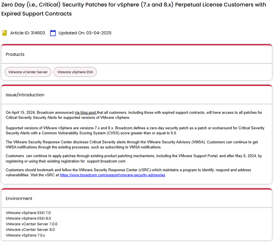 Broadcom stellt für vSphere 7 und 8 kostenlos "zero day" patches zur Verfügung, auch für Kunden ohne aktiven Support: