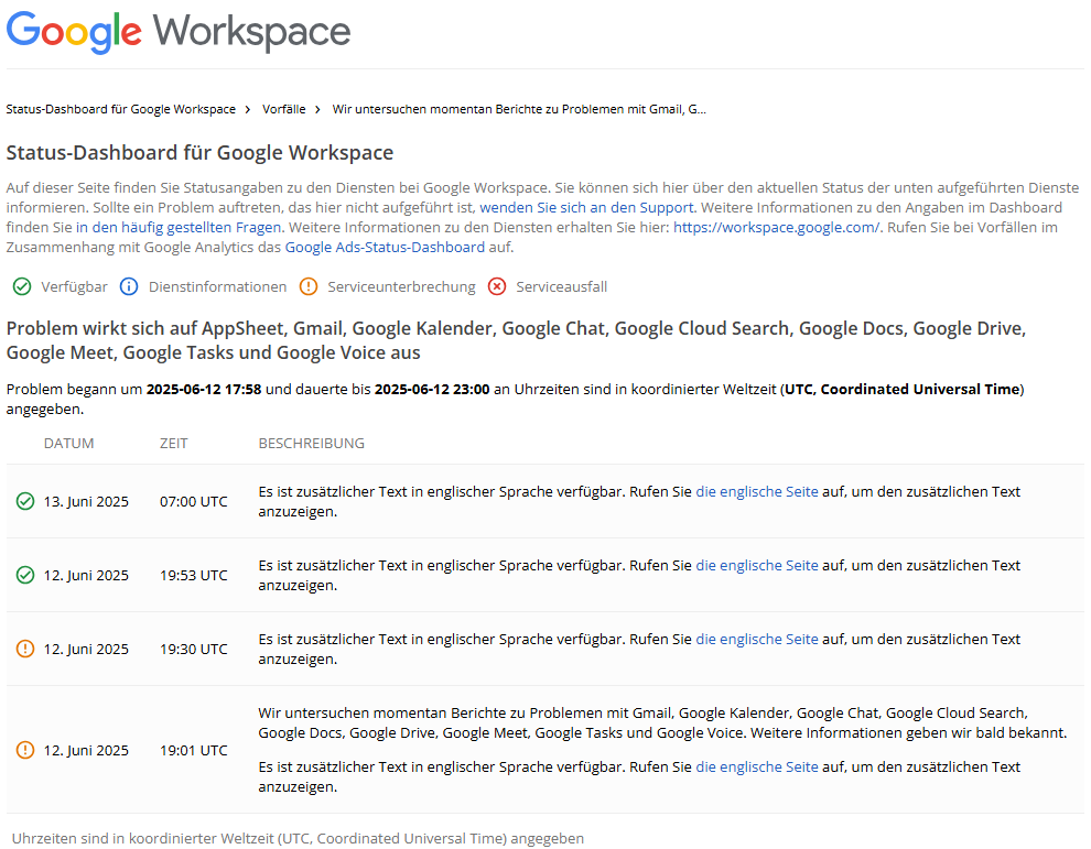 Die Google-Statusseite listet das Problem vom 12.6.2025 ab 10:51 Uhr bis 18:18 Uhr US-Pazifik-Zeit. Laut erstem Eintrag (obiger Screenshot) wurde die erste Meldung um 19:01 UTC abgesetzt und besagt, dass man Berichte zu Störungen untersuche. Gegen 19:53 UTC wurde die Störung als behoben angegeben.