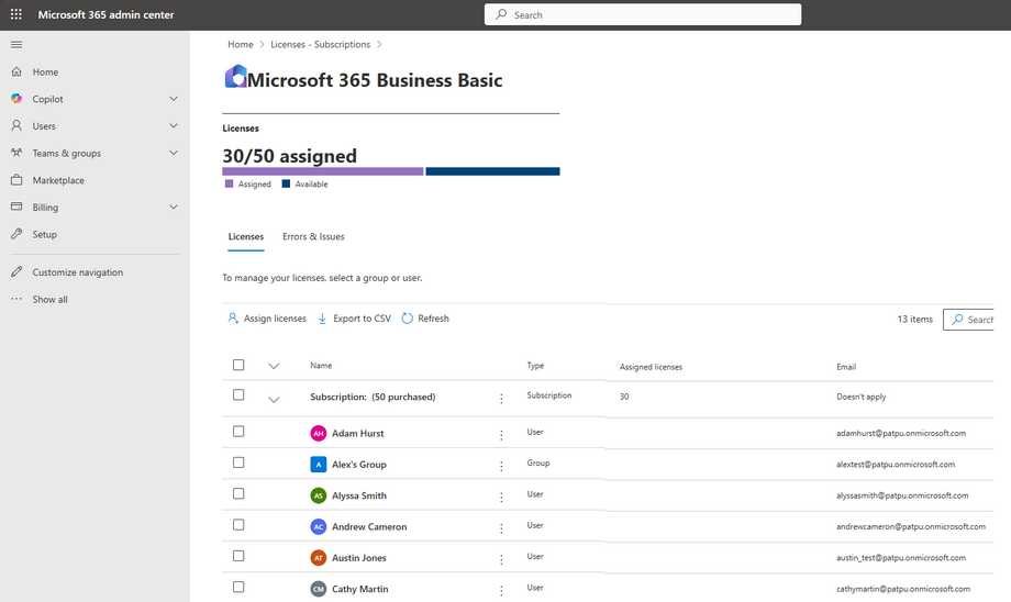 - Eine einheitliche Lizenzansicht zeigt sowohl benutzerbasierte als auch gruppenbasierte Lizenzzuweisungen in einer einzigen Liste an.