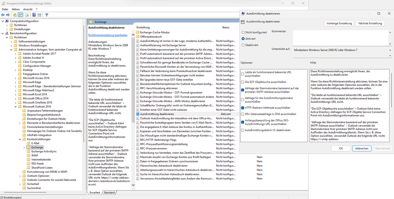 Der Leser hat dann die Exchange Gruppenrichtlinie AutoErmittlung deaktivieren gesetzt und schreibt: "Ich würde mich recht sicher festlegen, das diese Einstellung der GPO das Problem beseitigt, das dieses Einstellungen alleine das Problem beheben. Bei meiner Testumgebung hat alles andere einzeln keinen Erfolg gezeigt. Das ist ja auch von einem Kommentar beschrieben, ich glaube das es dort aber mit der Registry angepasst wurde, ich finde GPOs besser (eigener Geschmack, keine Kritik). Ich bin durch, ich schreibe die Tage ob das Problem wirklich behoben ist."