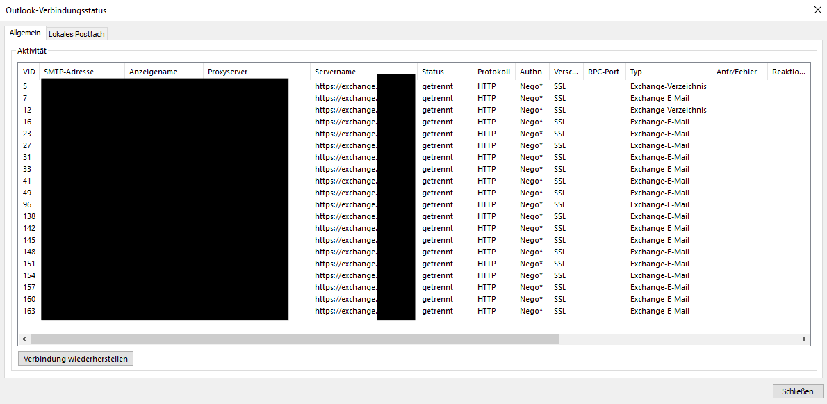 Schaut man sich den Outlook-Verbindungsstatus zum Microsoft Exchange-Server an, werden dort die Verbindungen als getrennt aufgelistet.