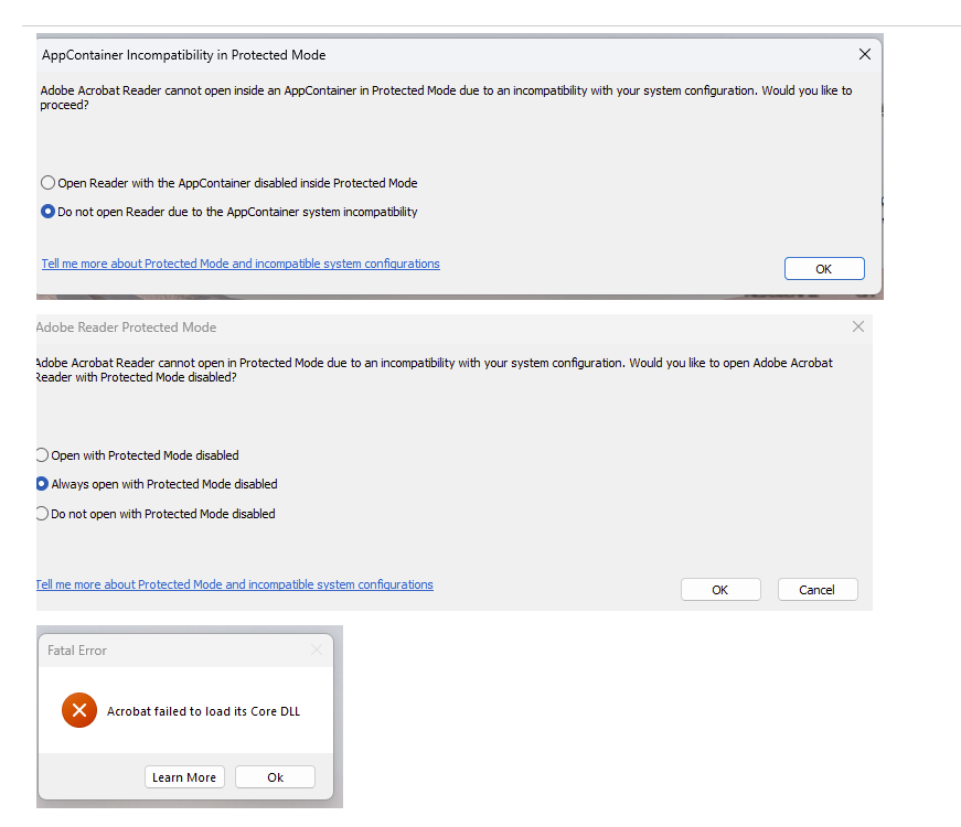 Adobe Acrobat Reader kann aufgrund einer Inkompatiblität mit deiner Systemkonfiguration nicht im geschützten Modus geöffnet werden. Soll Adobe Acrobat Reader im nicht geschützten Modus geöffnet werden?