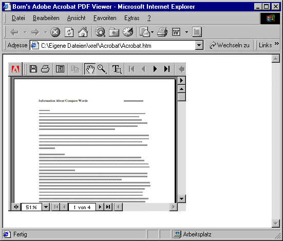 <html> <head> <meta http-equiv="Content-Type" content="text/html; charset=iso-8859-1"> <meta name="GENERATOR" content="Microsoft FrontPage Express 2.0"> <title>Born's Adobe Acrobat PDF Viewer</title> </head> <body bgcolor="#FFFFFF"> <p><object id="Test" name="Test" data="file:///C:/Test/Acrobat.pdf" classid="clsid:CA8A9780-280D-11CF-A24D-444553540000" align="middle" border="0" width="491" height="296">PDF</object></p> </body> </html> |